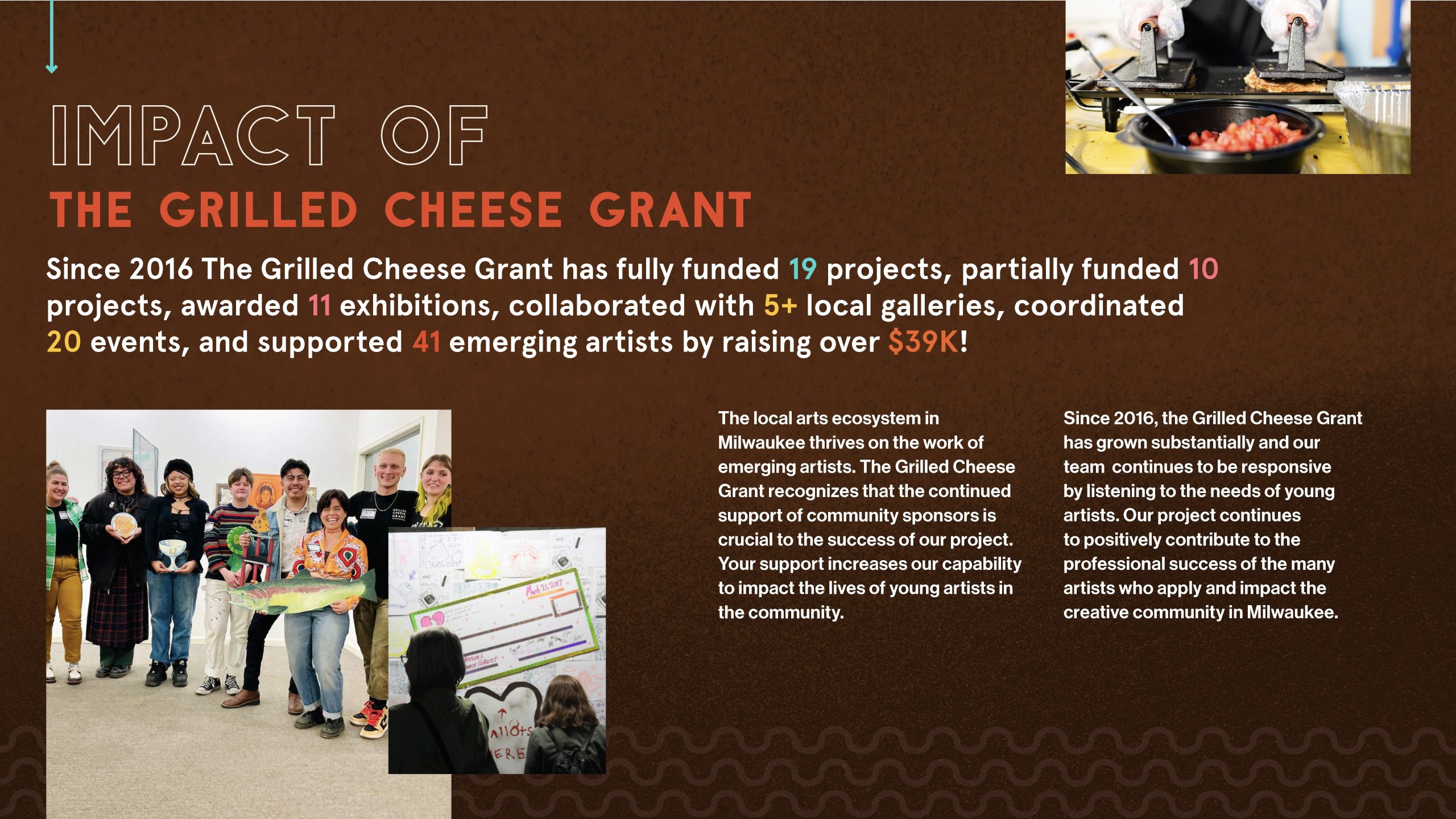 The Grilled Cheese Grant (GCG) is an annual community fundraising event and visual artist grant that provides financial support for undergraduate seniors and emerging artists in Wisconsin. The Grilled Cheese Grant was created in 2016 as a secondary platform for graduating seniors from the Milwaukee Institute of Art & Design (MIAD) and the University of Wisconsin Milwaukee (UWM) to receive financial support for their senior exhibition projects outside of their institution. In 2024, GCG expanded by opening applications to include emerging visual artists not associated with MIAD or UWM working within Southern Wisconsin.