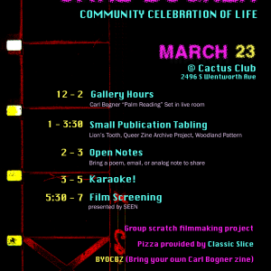 Cactus+ Moving Image’s vision is to create an environment conducive to critical engagement by showing work that takes risks, challenges norms, and opens conversations by showcasing a wide range of artist-driven independent media. As a series, we hope to offer a space for inter-generational attendees to engage with film, expanded cinema, and integrated moving image arts practices made by artists from a variety of backgrounds.