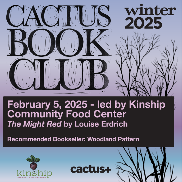 Join us Wednesday, February 5th for our next Cactus Book Club. This month Kinship Community Food Center will be leading the conversation on The Might Red: a Novel by Louise Erdrich. It’s a “novel of tender humor, disturbance, and hallucinatory mourning. It is about on-the-job pains and immeasurable satisfactions, a turbulent landscape, and eating the native weeds growing in your backyard. It is about ordinary people who dream, grow up, fall in love, struggle, endure tragedy, carry bitter secrets; men and women both complicated and contradictory, flawed and decent, lonely and hopeful. It is about a starkly beautiful prairie community whose members must cope with devastating consequences as powerful forces upend them. As with all of Louise Erdrich’s books, The Mighty Red is about our tattered bond with the earth, and about love in all of its absurdity and splendor.”