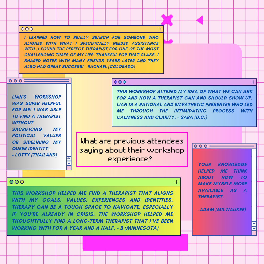 If you’ve ever felt that finding a therapist was daunting or had a provider that wasn’t quite right and swore off therapy, this workshop is for you!