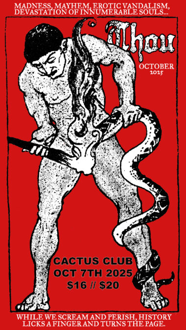 Thou is a metal band from Baton Rouge, Louisiana. Though oftentimes misread as “post rock” or “hipster doom” or lumped in with the Southern sludge, Black Sabbath-worship of New Orleans, Metairie, and Houma bands like Eyehategod, Crowbar, or Acid Bath—they share a more spiritual kinship with 90s proto grunge bands like Nirvana, Alice in Chains, or Soundgarden and the aesthetic and political impulses of obscure 90s diy Ebullition Vermiform hardcore punk. Since its inception in 2004, the band has released five full length albums, seven EPs (some bordering on full lengths), two collaboration records with The Body, two collaboration records with Emma Ruth Rundle, and enough material spread out over splits to make up another four or five full lengths.